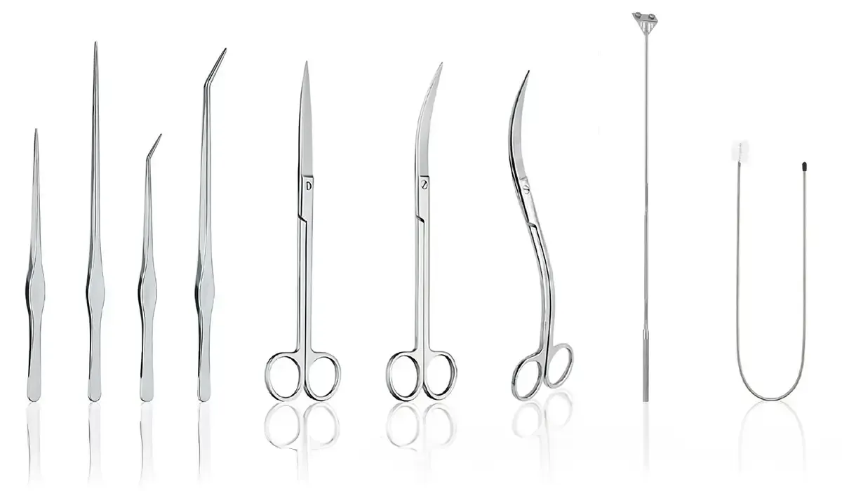 - Herramientas de mantenimiento: Pinzas, tijeras, rascadores y cepillos para facilitar el mantenimiento periódico del acuario.