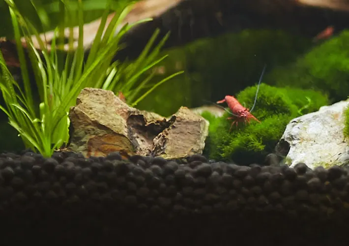 Además su granulometría es perfecta para las crías de gambas ya que les sirve de escondite y evitan ser depredadas por otras gambas o peces que habitan en el acuario.