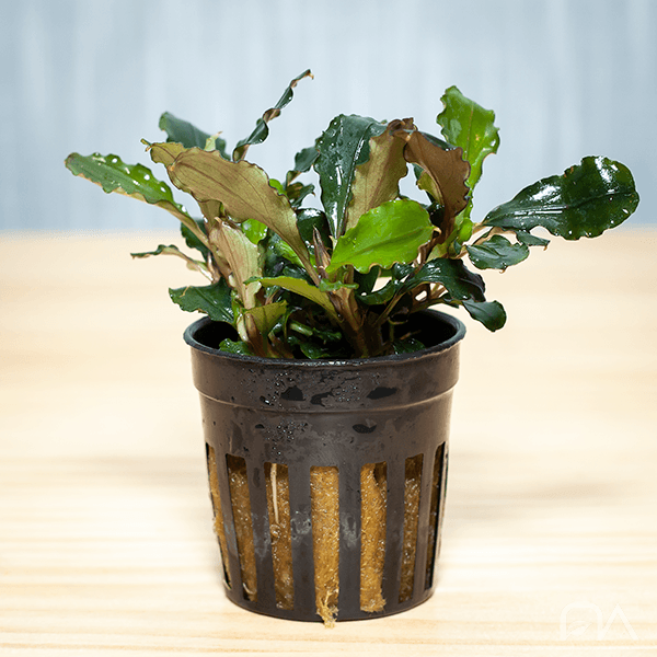 La Bucephalandra THEIA RED tiene las hojas onduladas de color marrón rojizo.