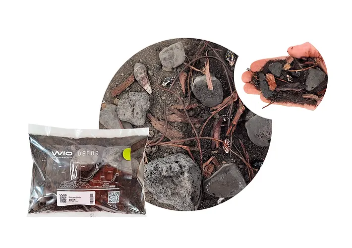 WIO Beck Biotope Bed Mix 3 litros (2 kg) es una mezcla de materiales naturales para la decoración del acuario a base de arenas y gravas junto con tiras oscuras de corteza , ramitas y hojas trituradas más claras.